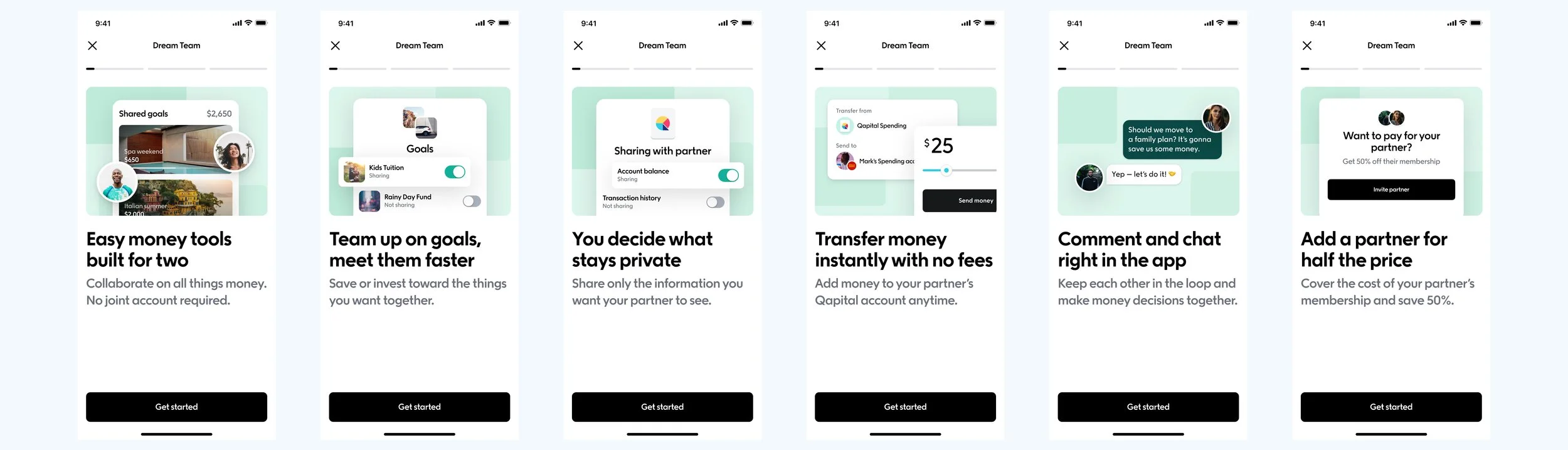 I also iterated on creative, concise ways to explain Dream Team features during the onboarding carousel for the product. I wanted to find a way to make the value propositions easily digestible and quick to read. Since this is such a complicated product with so many different functionalities (such as P2P transfers, separate but joint accounts, commenting within the app, etc.), finding a way to explain Dream Team in a matter of a few words was a harder challenge than expected. I worked with a designer to develop this onboarding carousel concept, and we brainstormed together on themes/metaphors that could explain the product well, but at the same time, make it less tech-y and finance-y. Eventually, we came up with basketball as a concept to illustrate the product’s main value props in a diverting, easy-to-understand way.