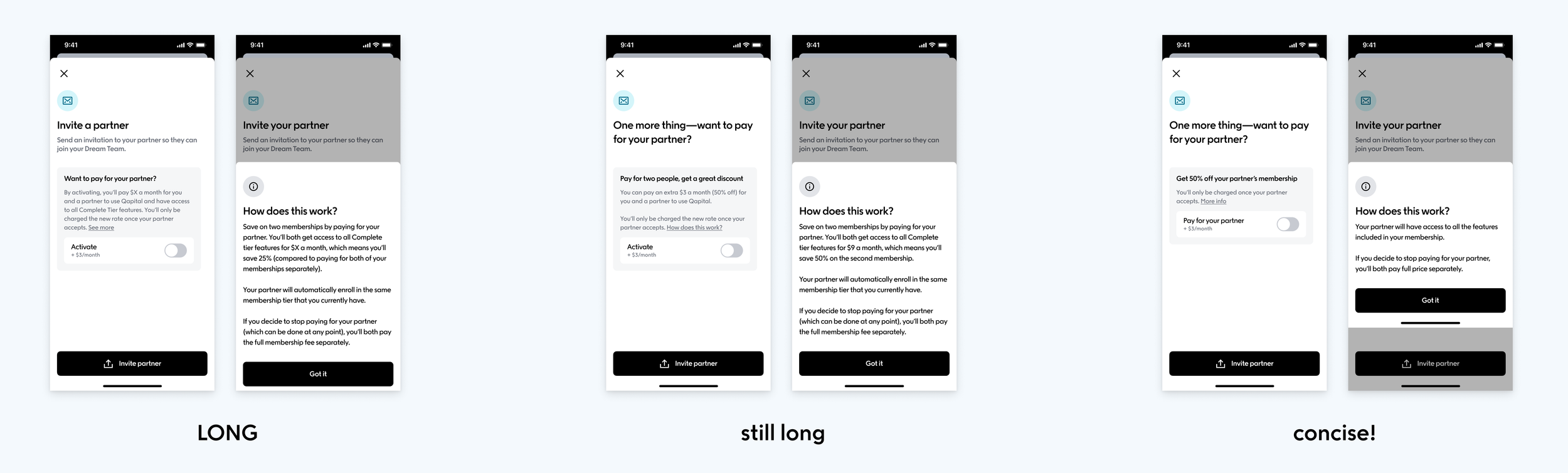 We added two simple screens that gave the person creating the Dream Team the option to pay for their partner. However, our legal team gave many requirements of what needed to be included here. After some back and forth, and ultimately some negotiation on behalf of the user, I was able to create a screen that was clear and concise, but still included all the most necessary info. Below you can see the progress of going from lengthy/wordy to short/sweet.