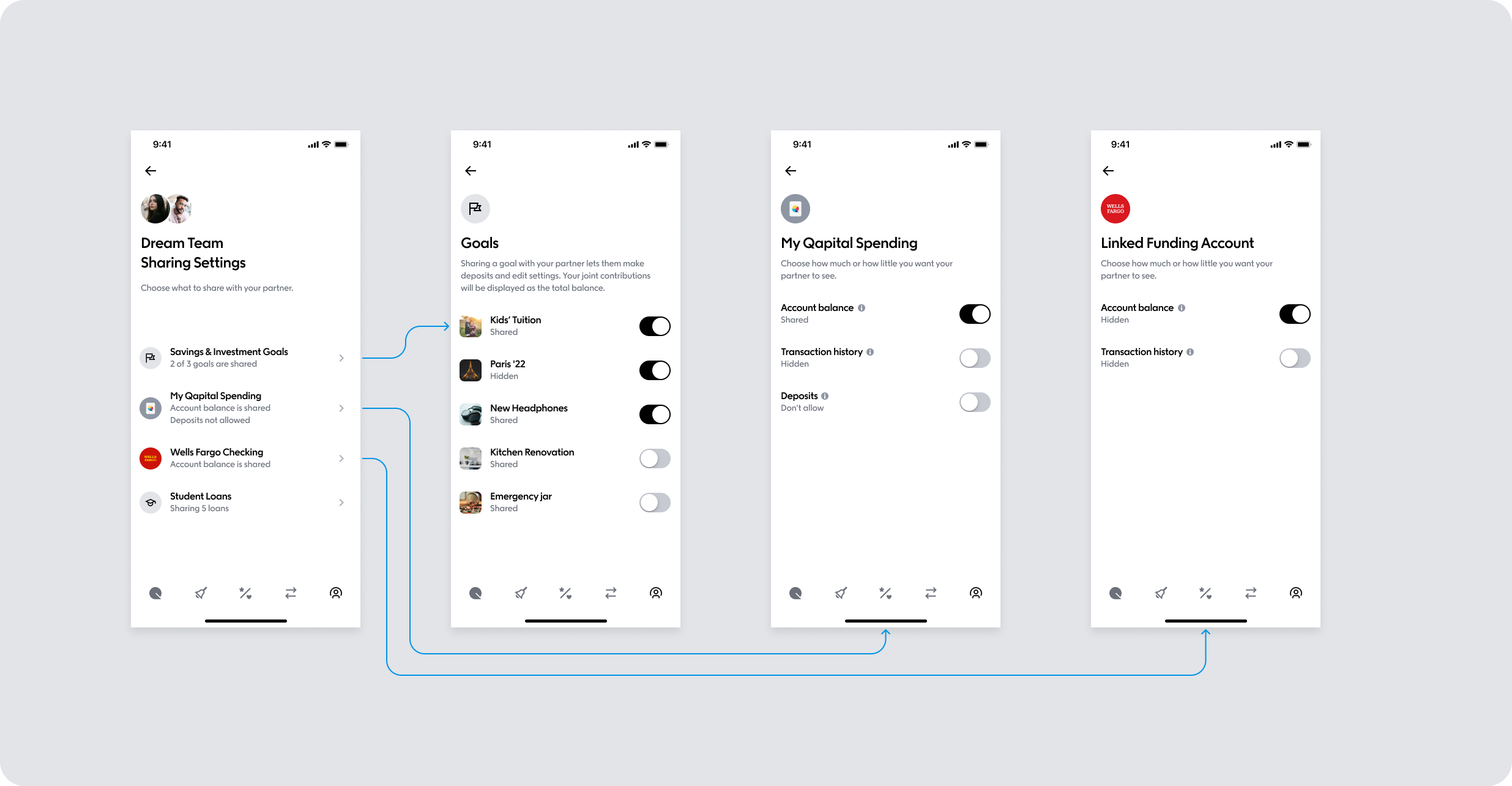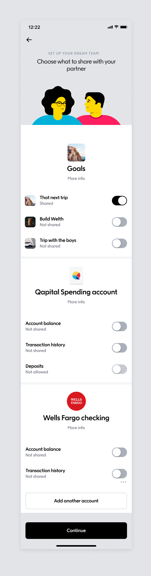 A few months after launching Dream Team, we saw that a lot of user dropoff was happening on the Settings page, where the user decides what goals and accounts they want to share with their partner. In order to reduce friction, I paired with a designer to rethink the information architecture of this Settings page. We took it from all living on one lengthy screen to creating an accordion-like experience.