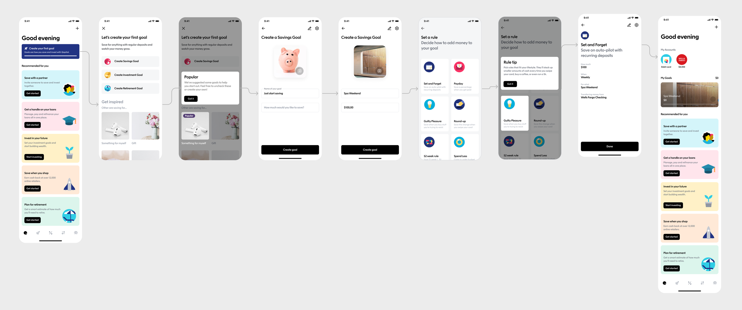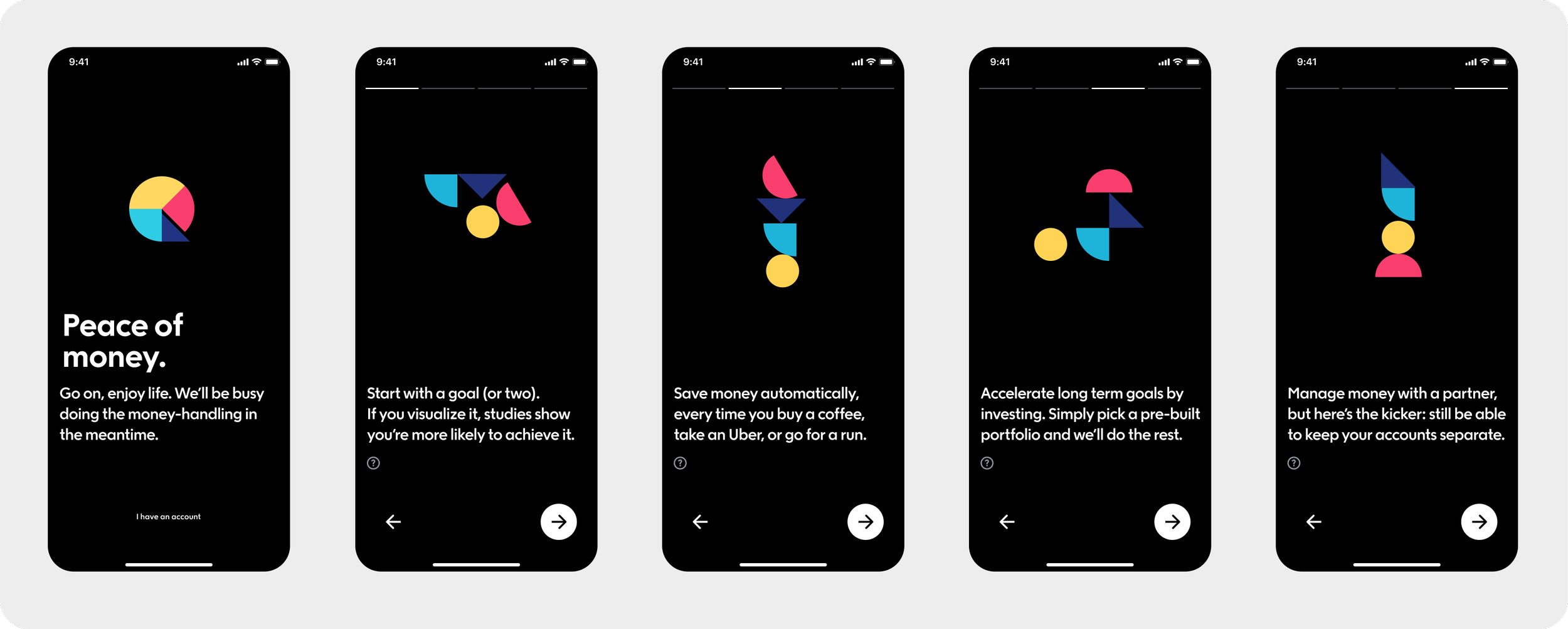 By using progressive disclosure, we ease the cognitive burden on the user and allow them to digest information one bit at a time. Because our app contains so many different features that pertain to an overall vision of financial health, it becomes cumbersome to dedicate 1-2 screens to each feature. Instead, we have small moments to highlight the user benefit that each feature can provide.