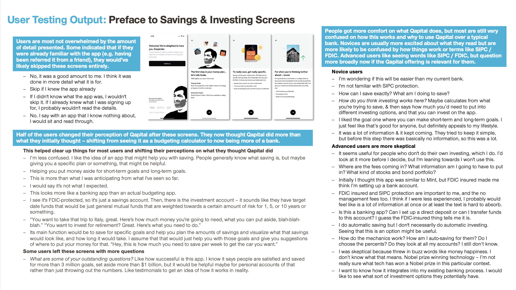 When I joined Qapital, the app had a 40+ screen onboarding that took users over 10 minutes to complete. Through user testing we were able to pinpoint the exact places that users were dropping off. From there, I strived to make the onboarding clear, concise, and convincing by slashing several screens, condensing many lines of text, and ultimately advocating to change the structure of the onboarding—moving away from a linear explanation and toward a progressive disclosure model.