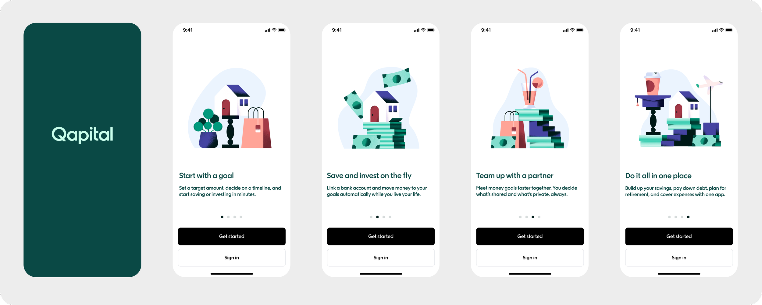 Upon further iteration, I decided to go with something a little bit shorter, and with clearer value props. By keeping the headers to 5-6 words, it’s easy for a user flipping through these screens to quickly scan the headlines and know what they’ll be able to get out of Qapital.
