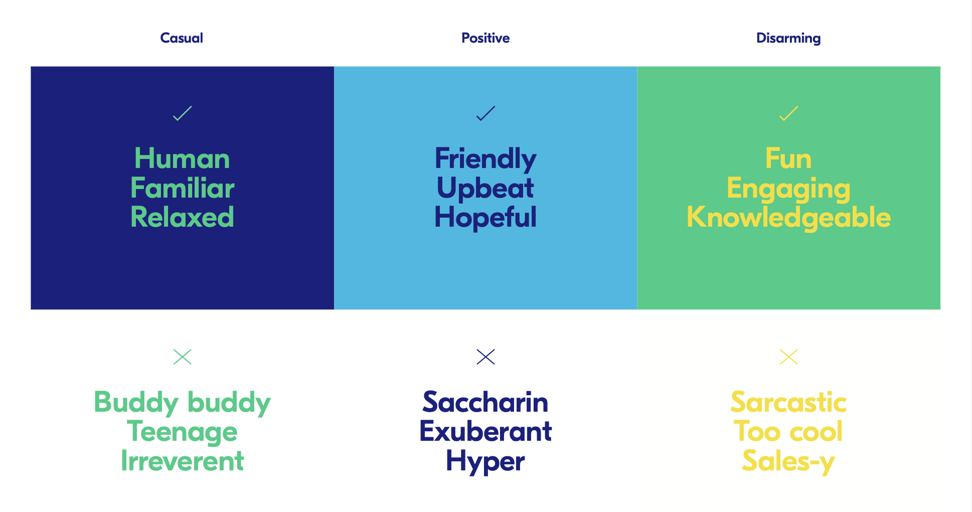 We decided that our voice would be casual, positive, and disarming, and I created a tone flexing guide (below) to capture exactly how we wanted to sound.